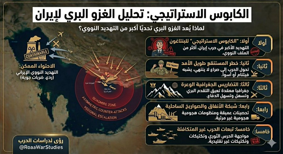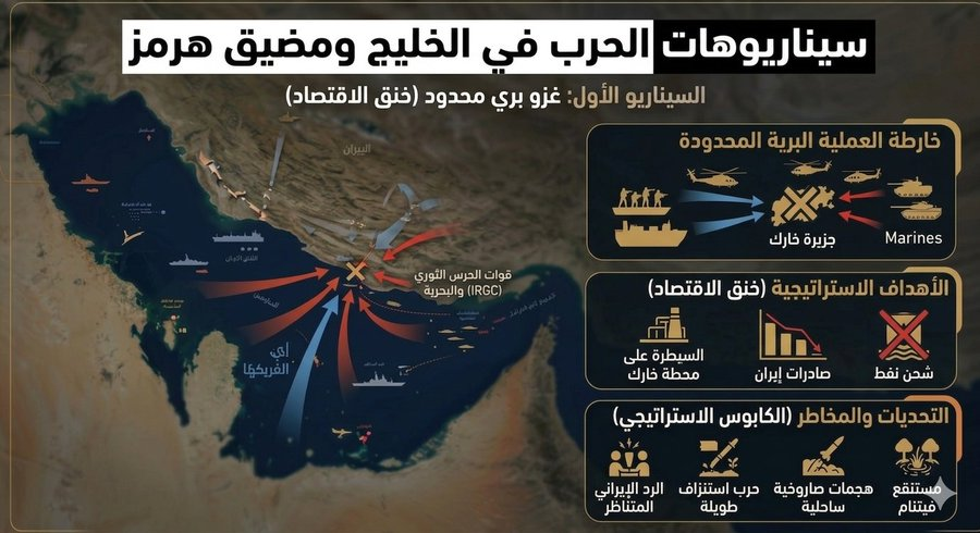 ترامب أبلغ مستشاريه أمس استعداده لإنهاء الحرب حتى لو بقي المضيق مغلقا، لتجنب إطالة الصراع. في الوقت ذاته البنتاغون يعد خططا لعمليات برية محدودة وينشر 3500 من مشاة البحرية و1500 من الفرقة 82 المحمولة جوا مع قوات خاصة.