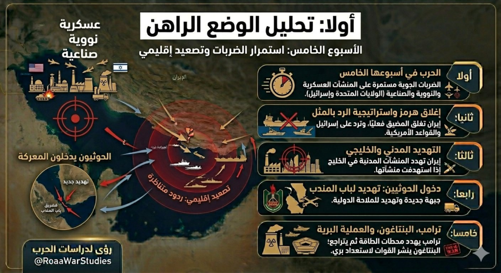- الحرب مستمرة في أسبوعها الخامس: الولايات المتحدة وإسرائيل يواصلان الضربات الجوية على المنشآت العسكرية والنووية والصناعية.