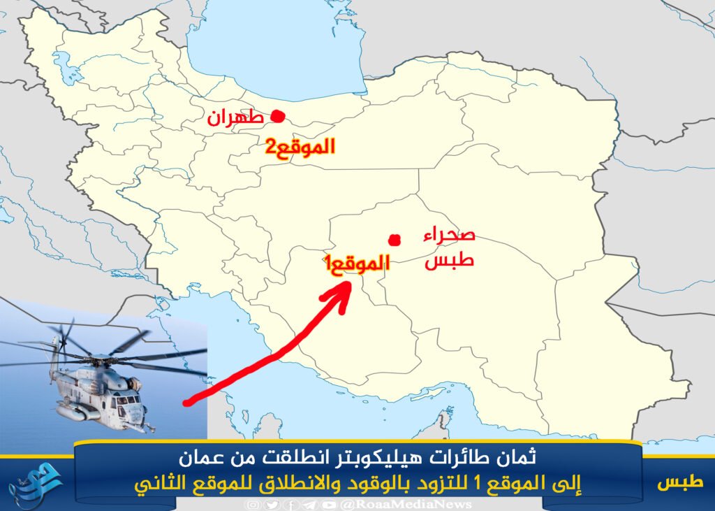 ثم تأتي 8 طائرات هيليكوبتر نقل من طراز RH-53 تابعة لمشاة البحرية الأمريكية من قواعد قريبة في عمان إلى الموقع الأول ويتم تزويدها بالوقود والانطلاق بالجنود إلى الموقع الثاني 52 كم جنوب العاصمة طهران.
