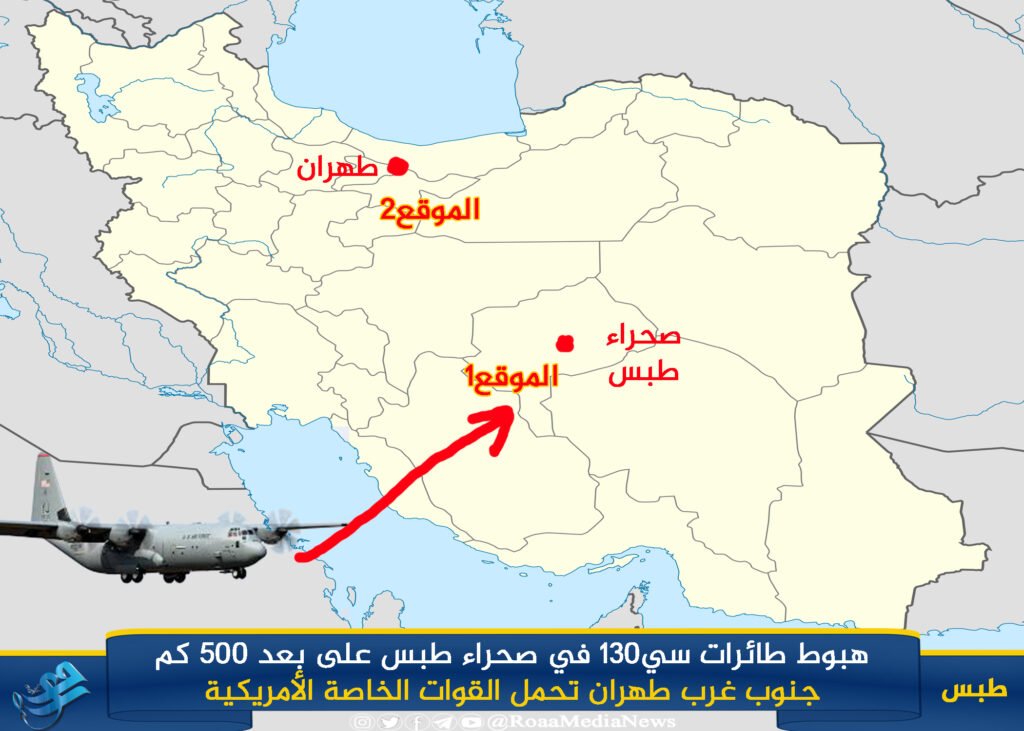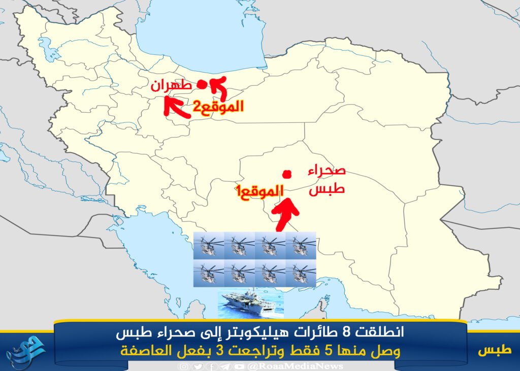 ثم انطلقت الهيلوكوبترات من حاملة الطائرات USS Nimitz التي كانت تبحر في خليج عمان إلى صحراء طبس، لكن رياح العاصفة هبت بغير ما تشتهيه الطائرات الأمريكية، فتعطلت 3 طائرات واضطرت للعودة إلى حاملة الطائرات وبهذا نزلت 5 طائرات فقط في الموقع1.