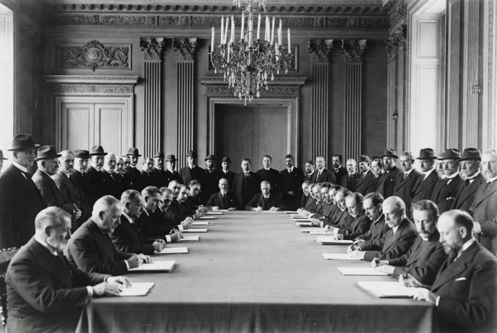 مع انتهاء الحرب العالمية الأولى عقد المنتصرون مؤتمر باريس 1919 م (معاهدة فرساي) وشكلوا عصبة الأمم (نواة الأمم المتحدة) لتقاسم السلطة الدولية على العالم دون نزاعات بين القوى العظمى.